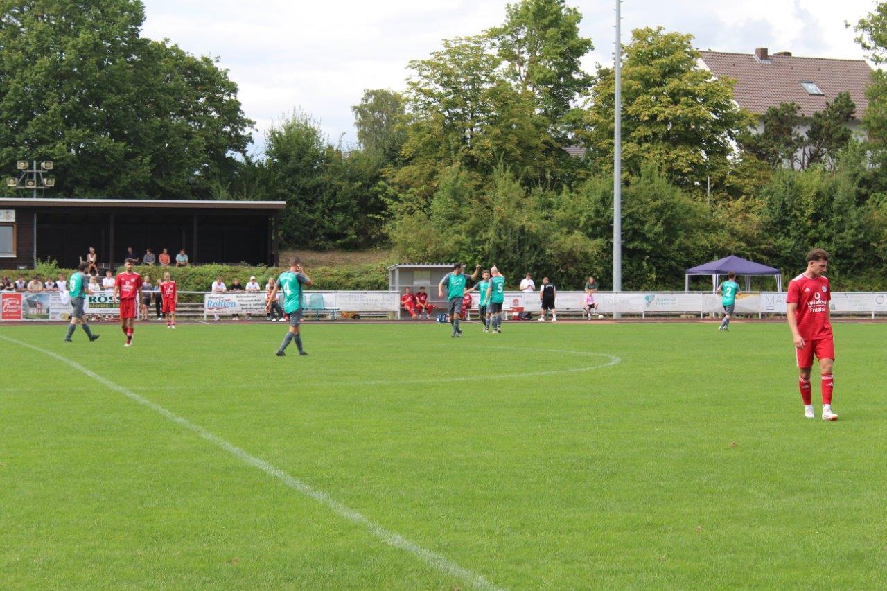 Im Vorspiel begegneten sich auf anderem Geläuf (Rasenplatz Dissen), die dritte Vertretung der FSG und die zweite Mannschaft der SG Altmorschen/Binsförth. Die SG reiste personell deutlich angeschlagen nach Dissen uns so konnte man die Treffer zum 1:0 in der 11. Minute und zum 2:0 in der 36. Minute nicht verhindern. Trotz der beiden Tore in Halbzeit eins und einigen vielen vergebenen Großchancen, war es eine sehr ausgeglichene Partie. In Halbzeit zwei erhöhte der Gastgeber dann auf 3:0. Wen man nun glaubte, das Spiel sei gelaufen, irrte man sich. In den letzten 20 Minuten bäumte sich die SG gegen diese vermeidliche Niederlage auf und man konnte durch Hamrucu auf 3:1 verkürzen. Nur drei Minuten später erhöhte die FSG auf 4:1 aber auch das konnte kam abschütteln. In Minute 82 und 83 gelangen Deist und Hamrucu das 4:2 und 4:3. Jetzt war die SG wieder dran und man wollte, mit der durch den Schiedsrichter angekündigten „letzten Aktion“, noch den Ausgleich markieren. So warf man alle Mannen, auch den Torwart, zum Freistoß nach vorne, konnte den Ball aber nicht festmachen und statt das Spiel zu beenden, ließ der Schiedsrichter den Gegenzug der FSG beenden und damit den Endstand zum 5:3.